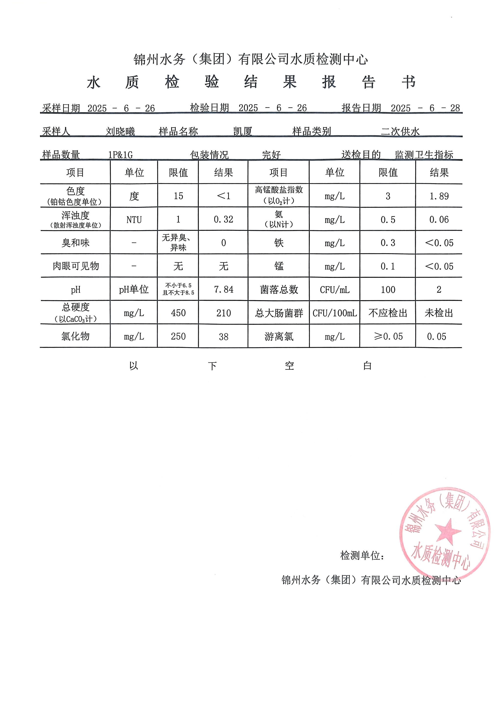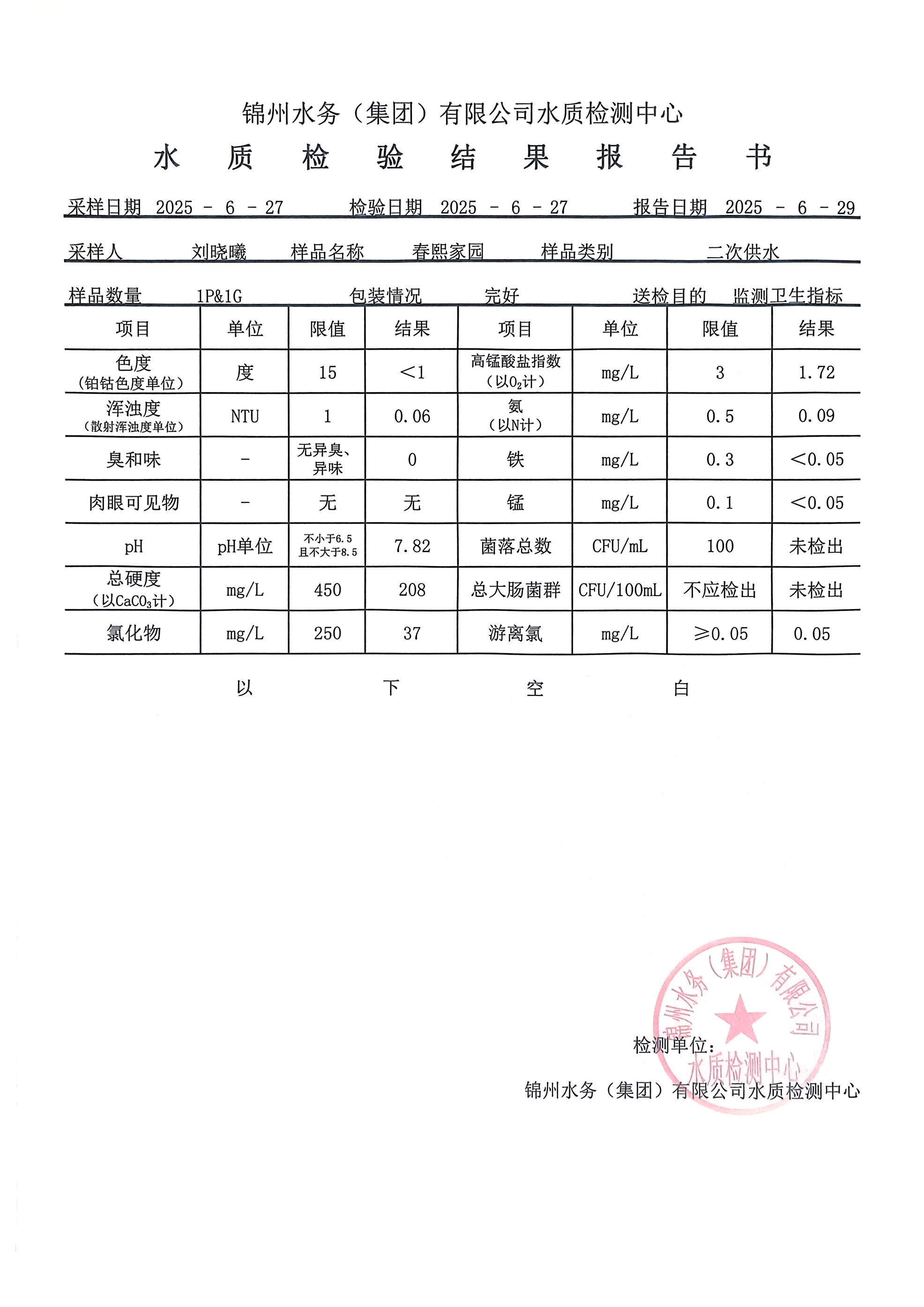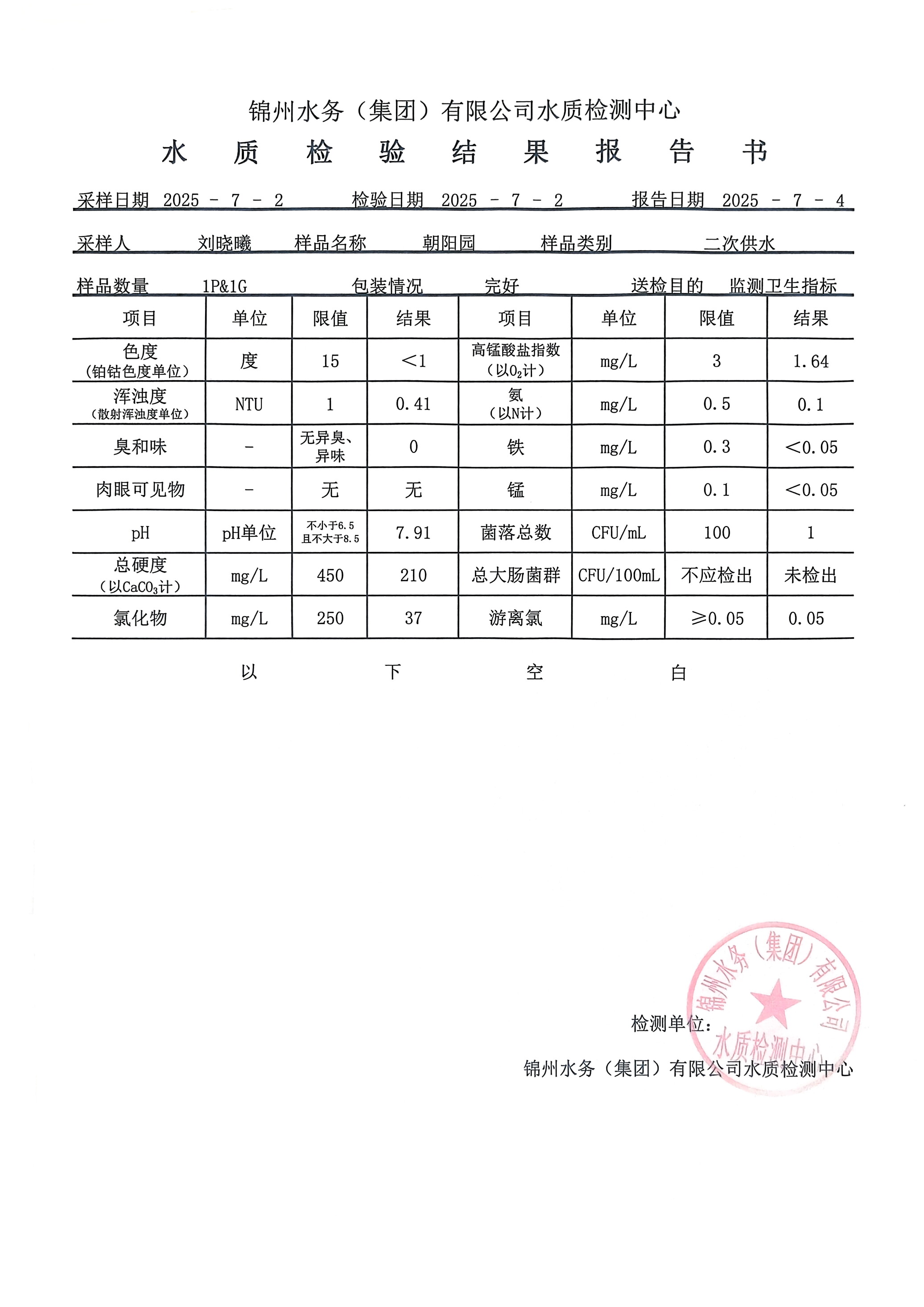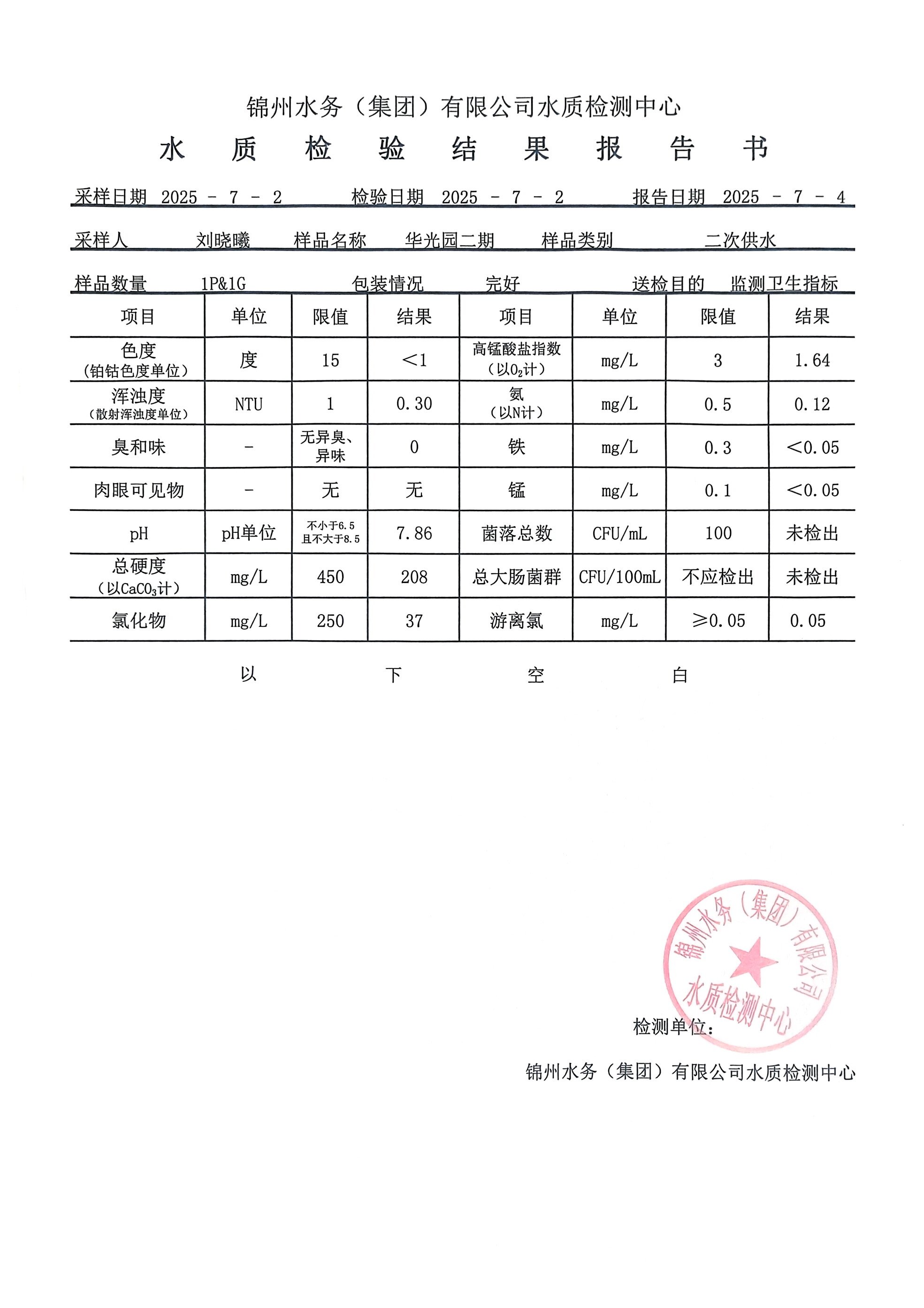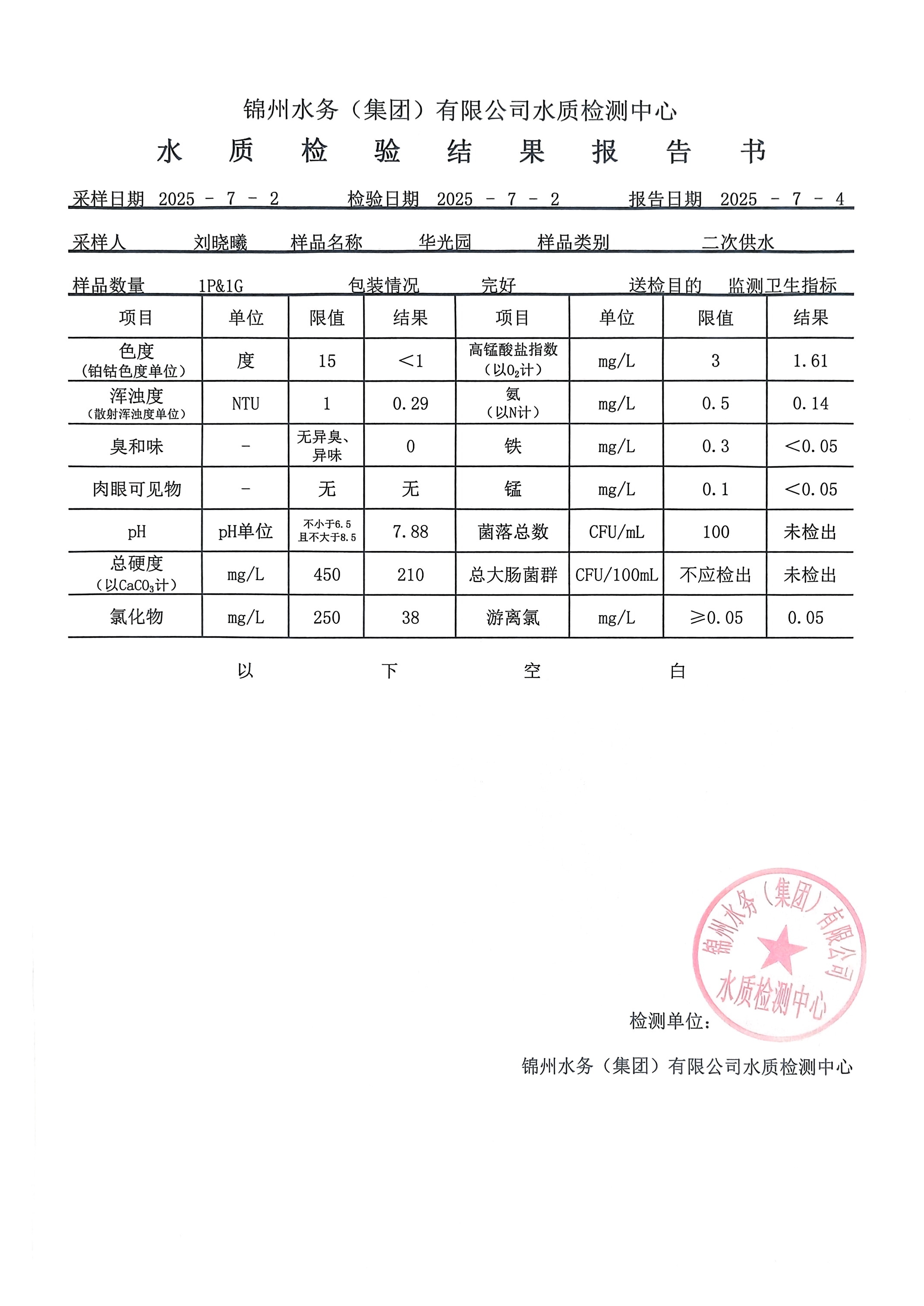 2025年6月28日—7月4日 二次供水检测报告水质报告