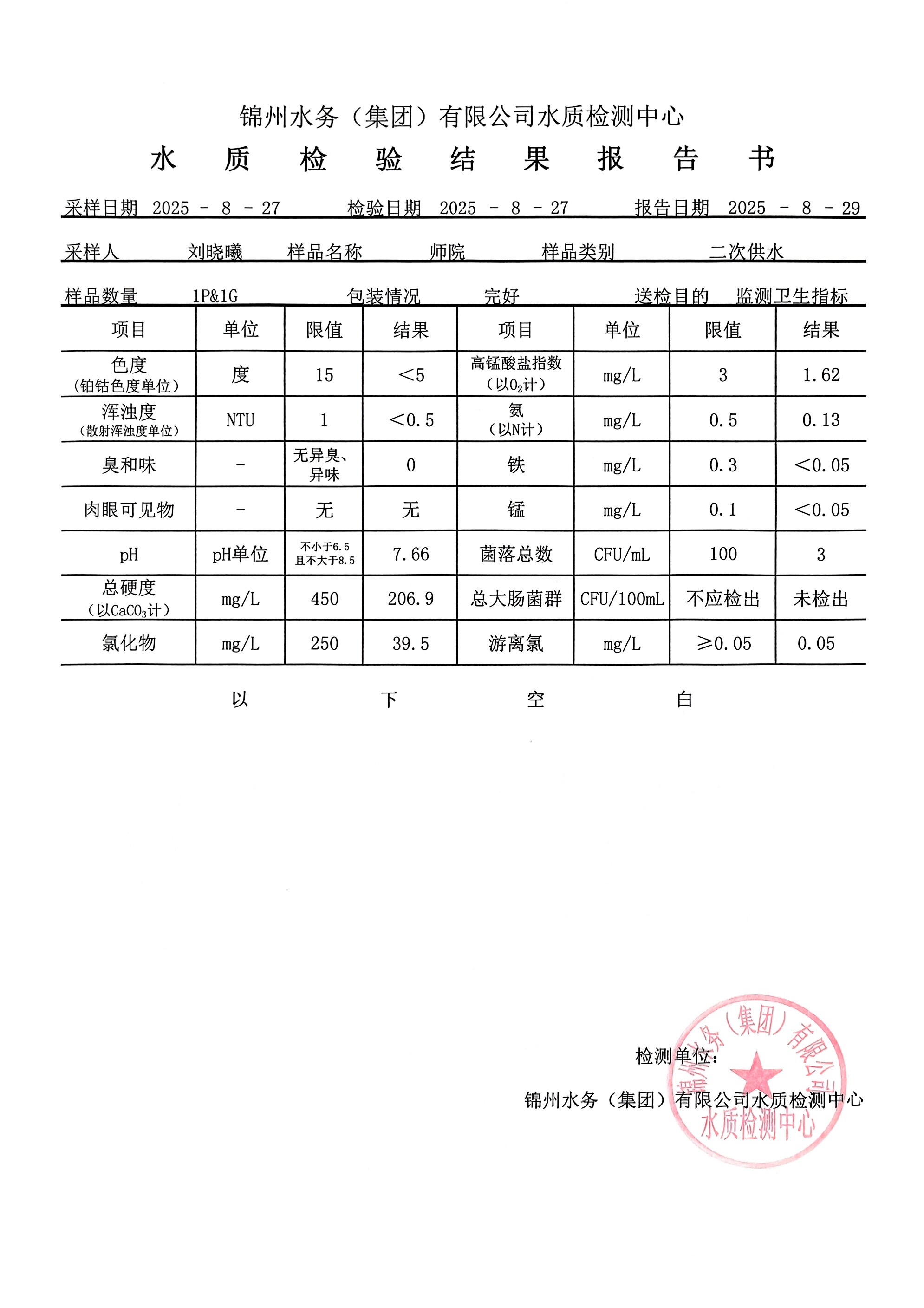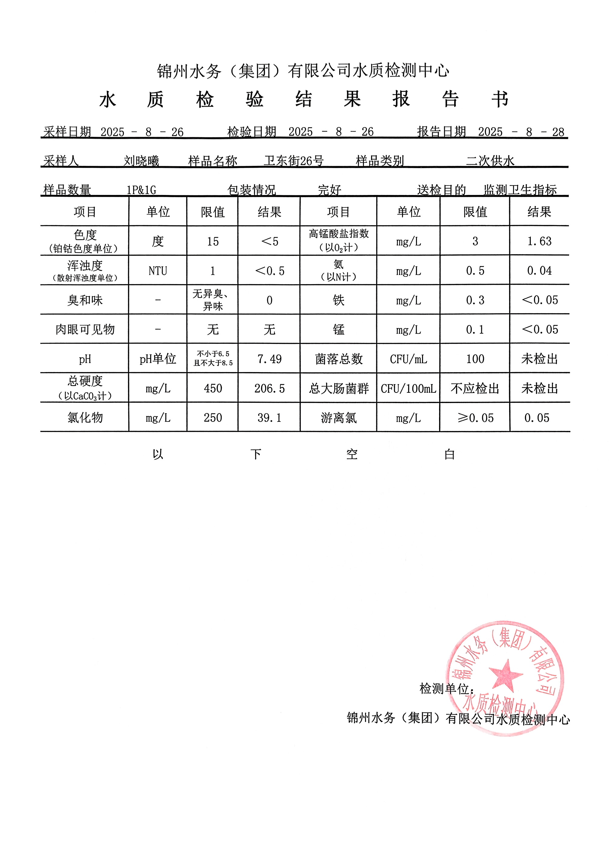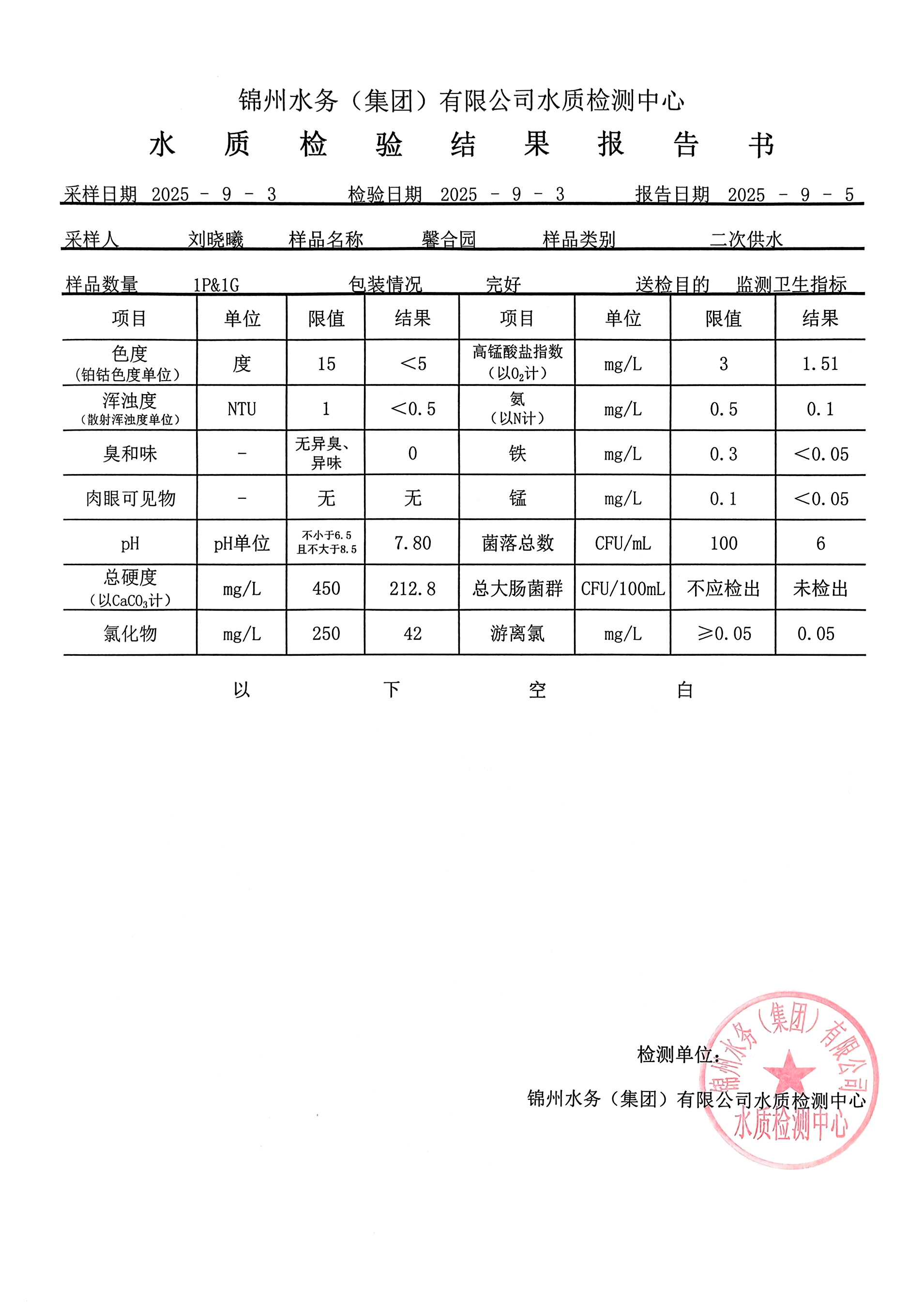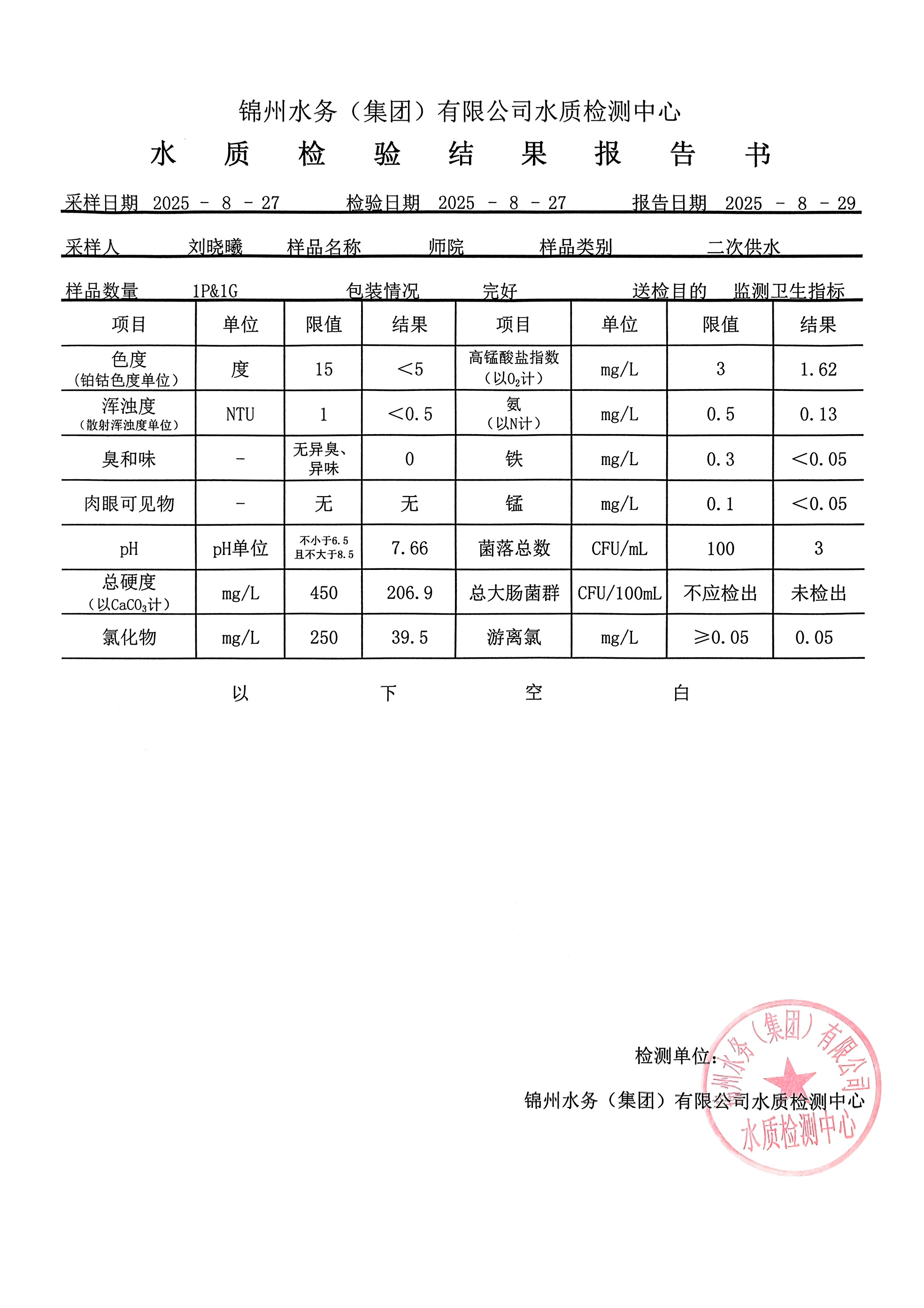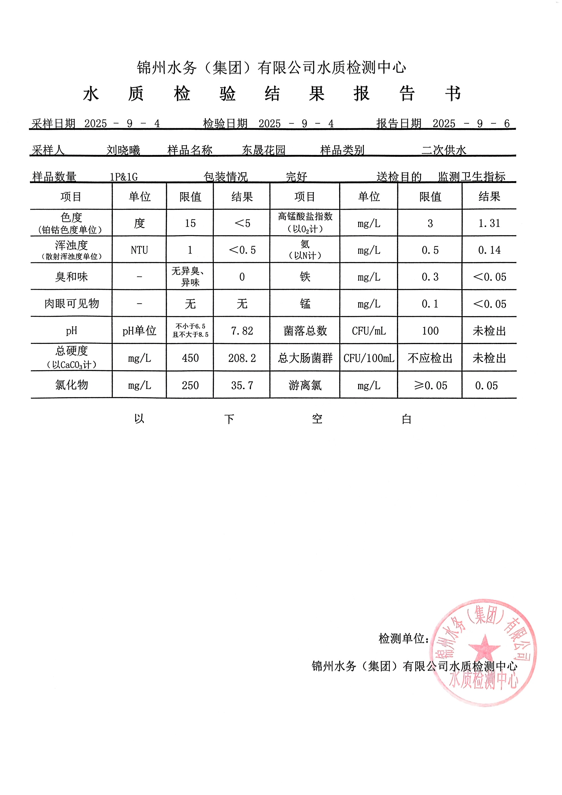 2025年8月28日—9月6日 二次供水检测报告水质报告