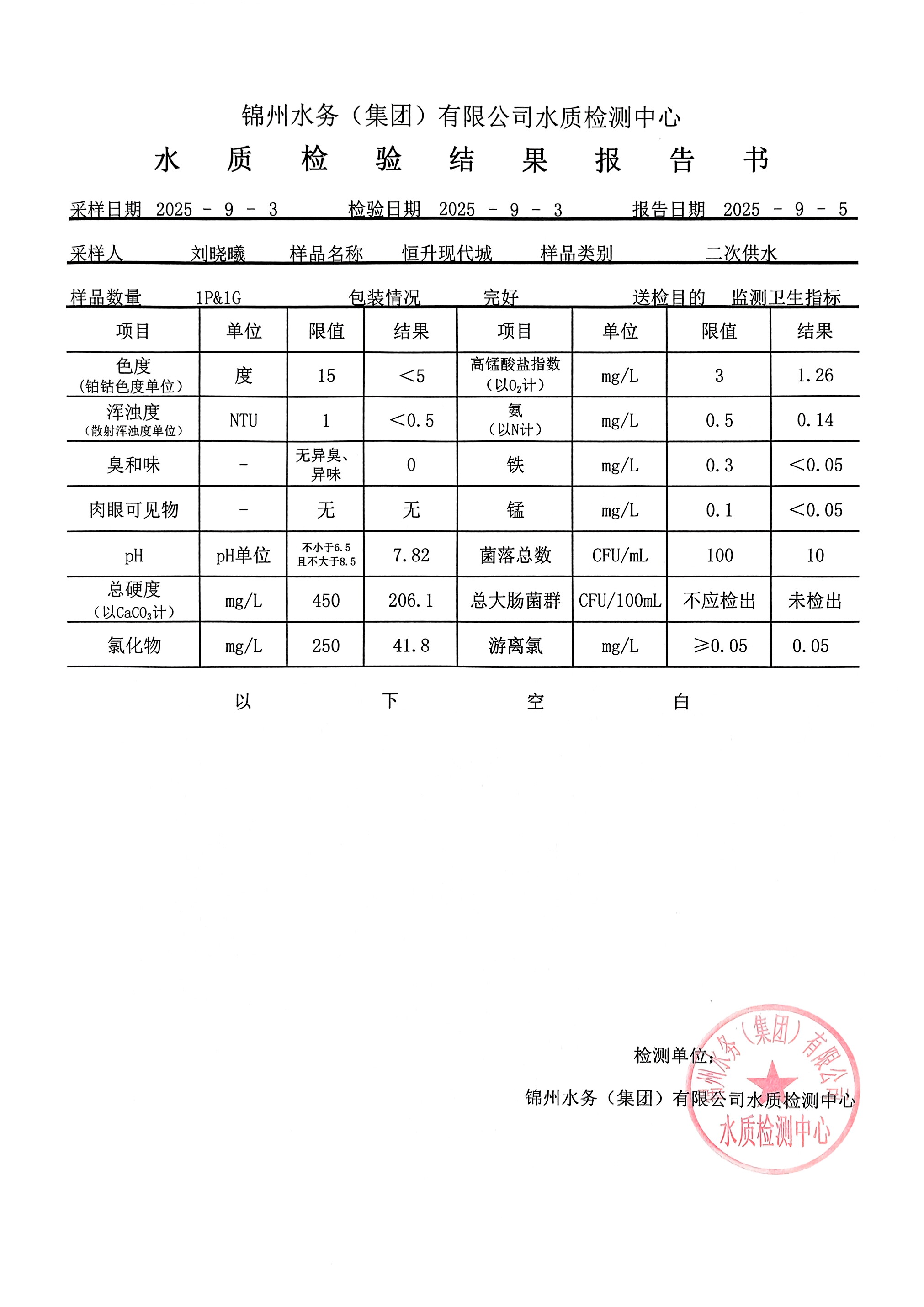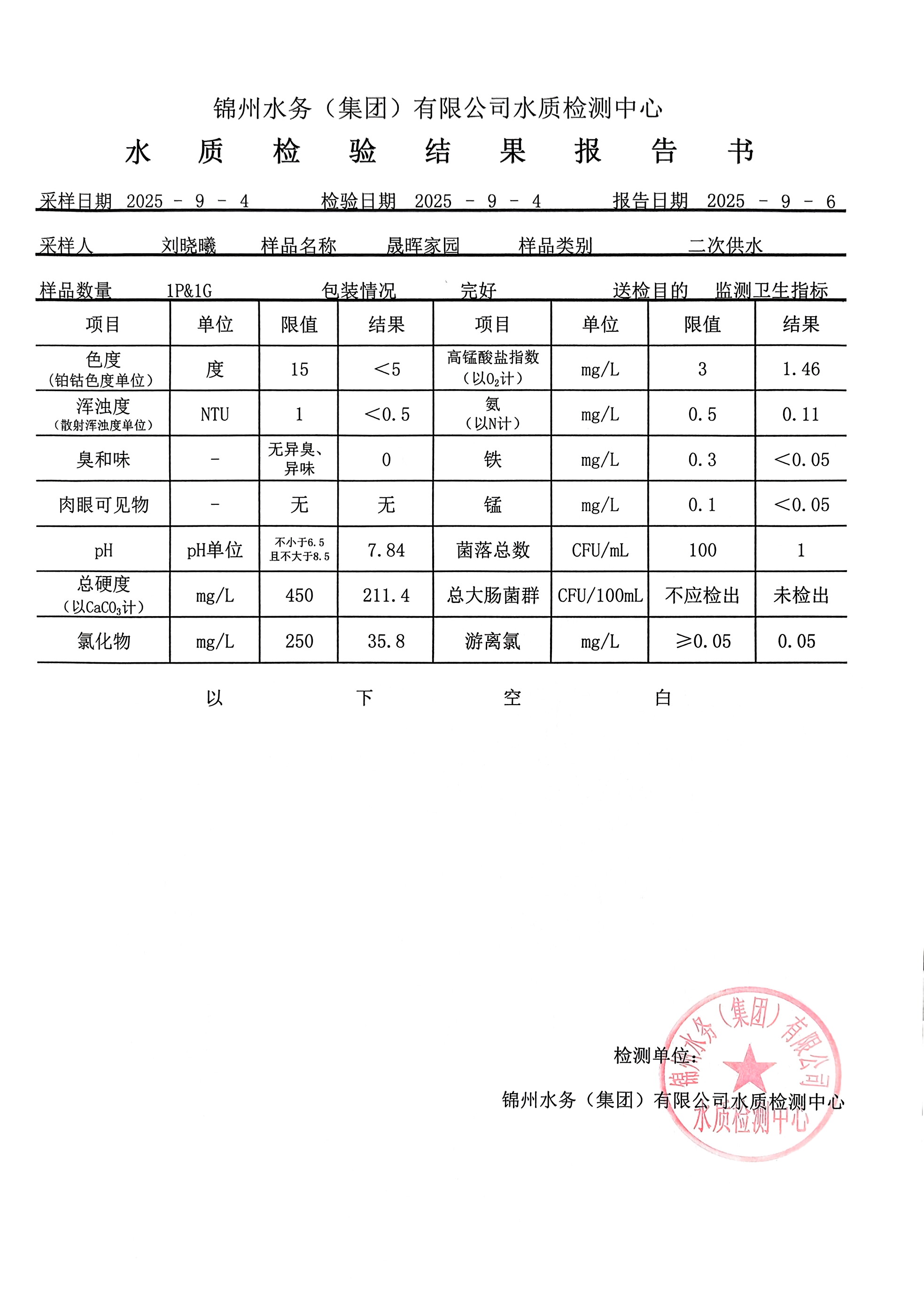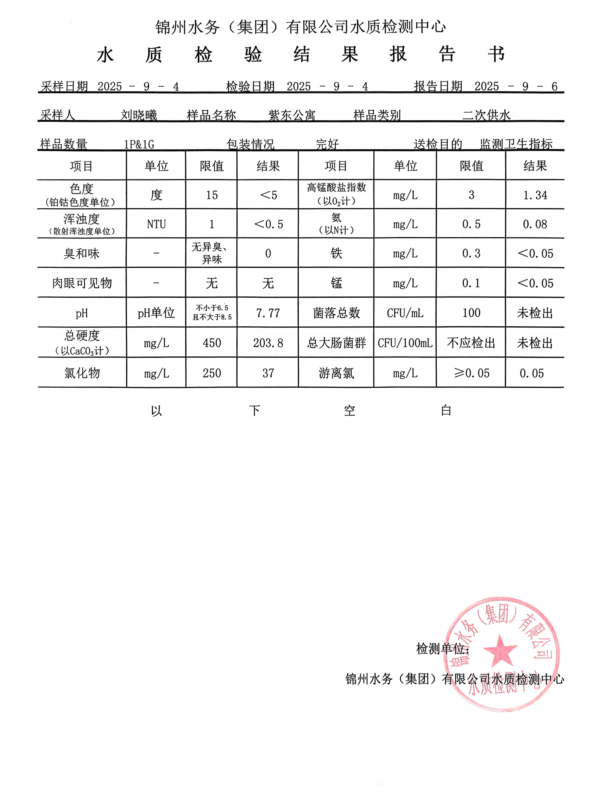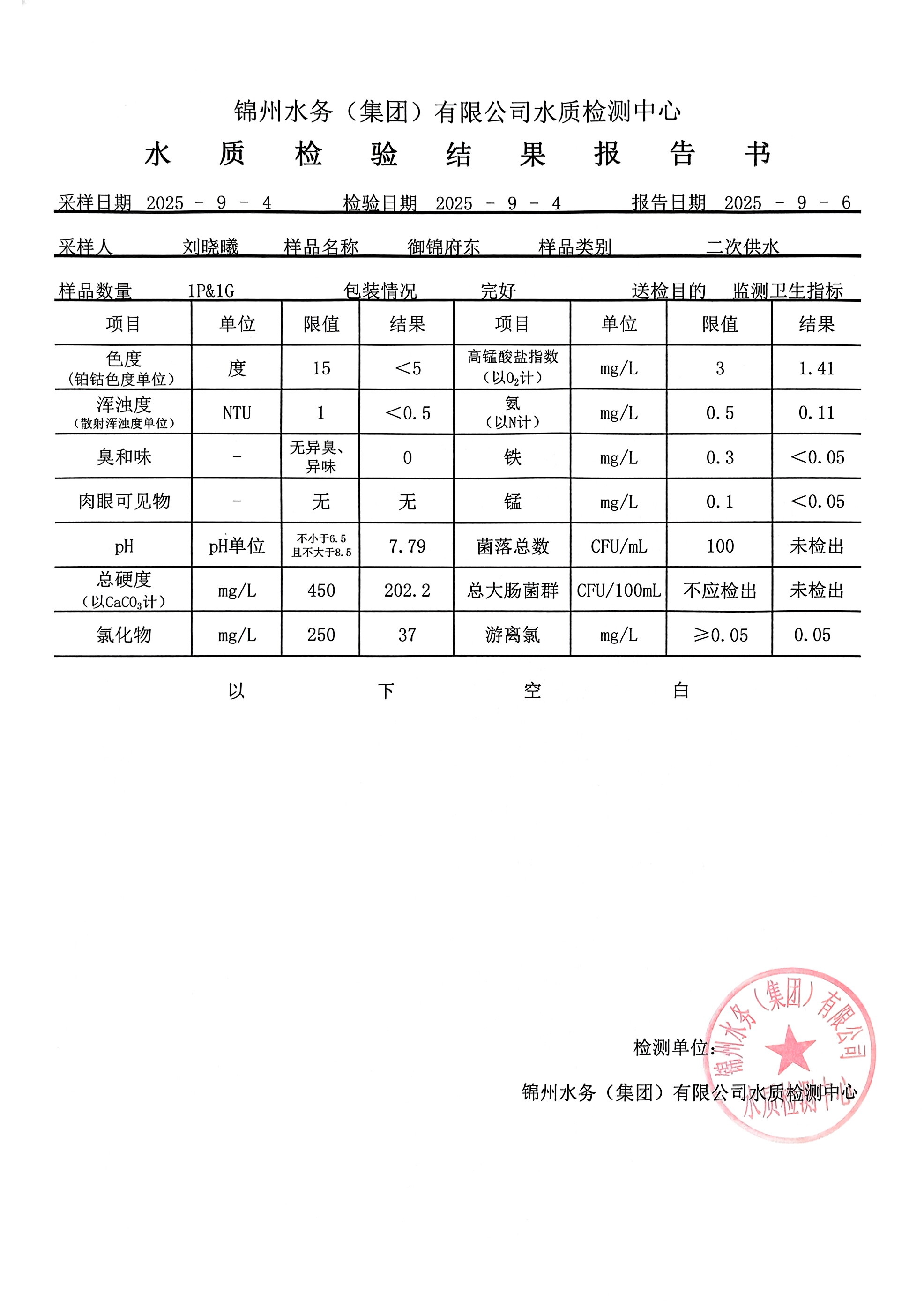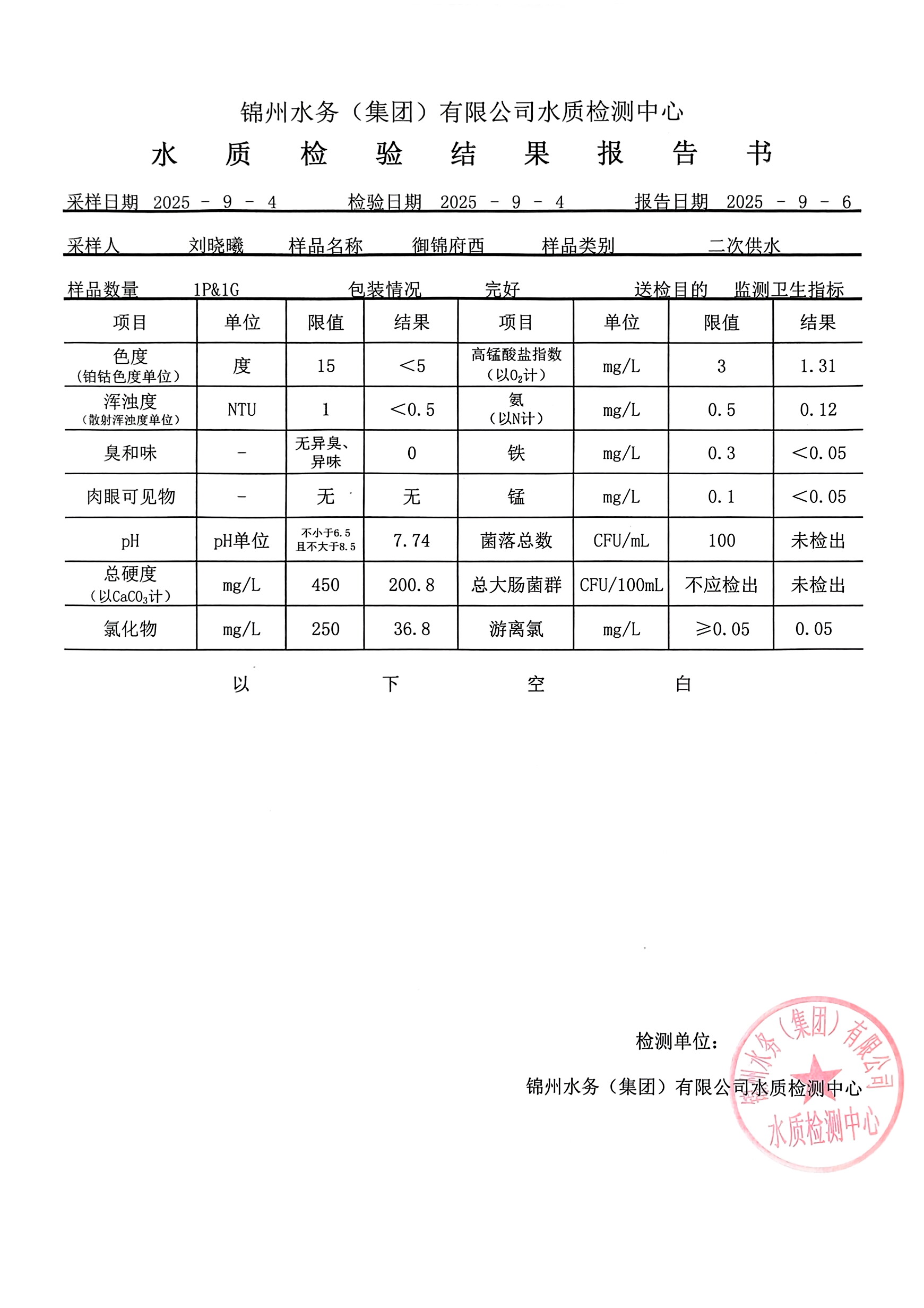 2025年8月28日—9月6日 二次供水检测报告水质报告