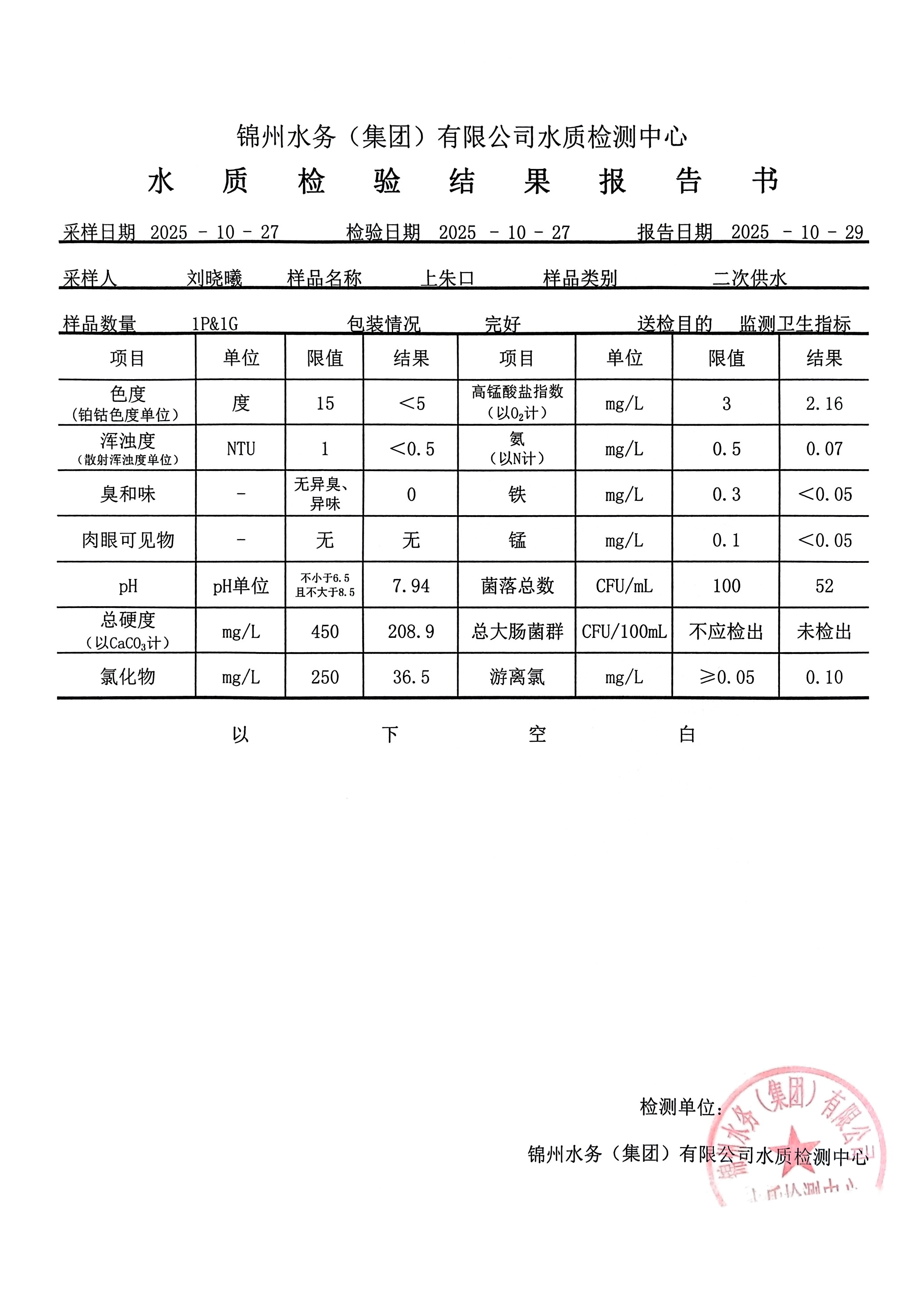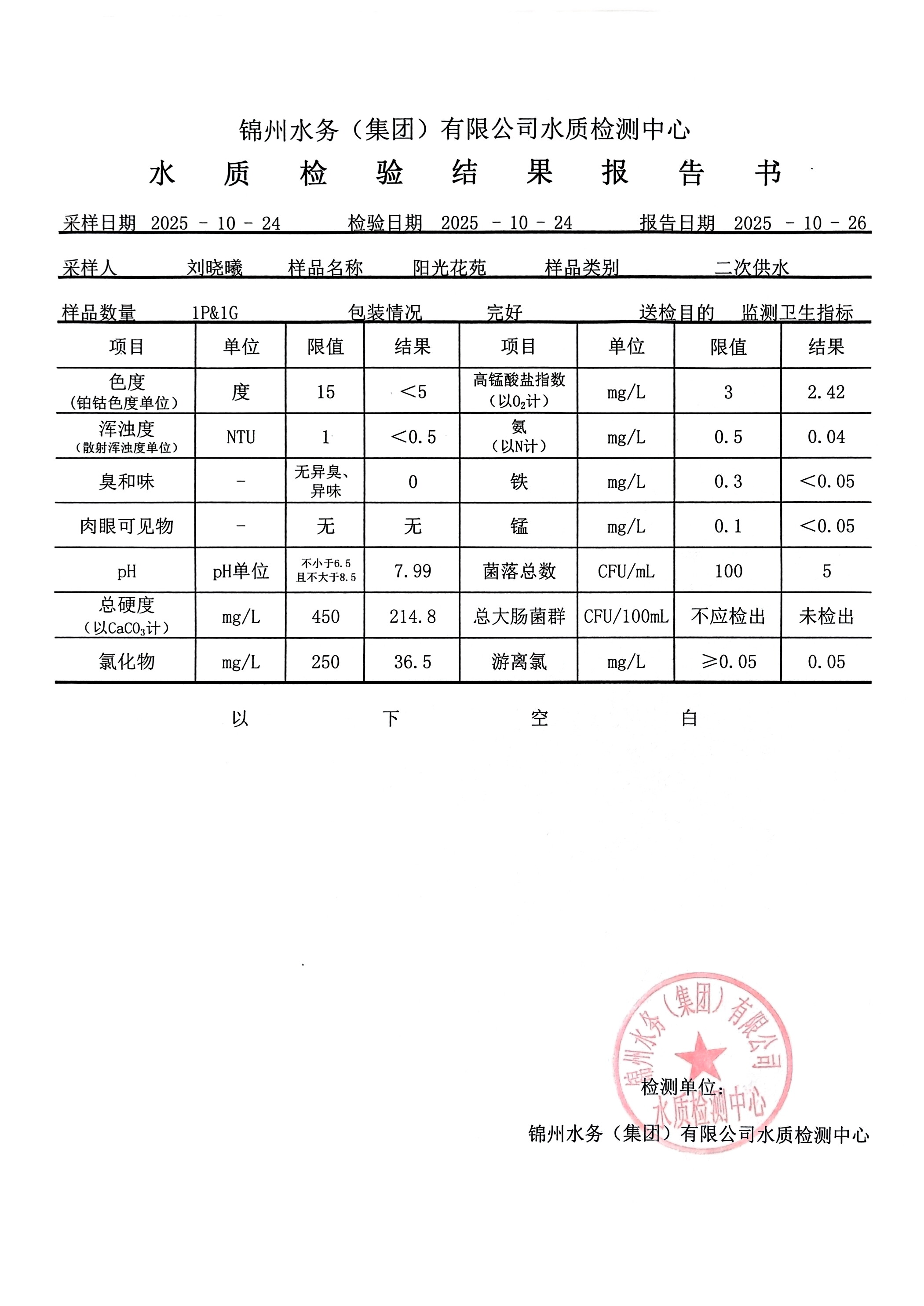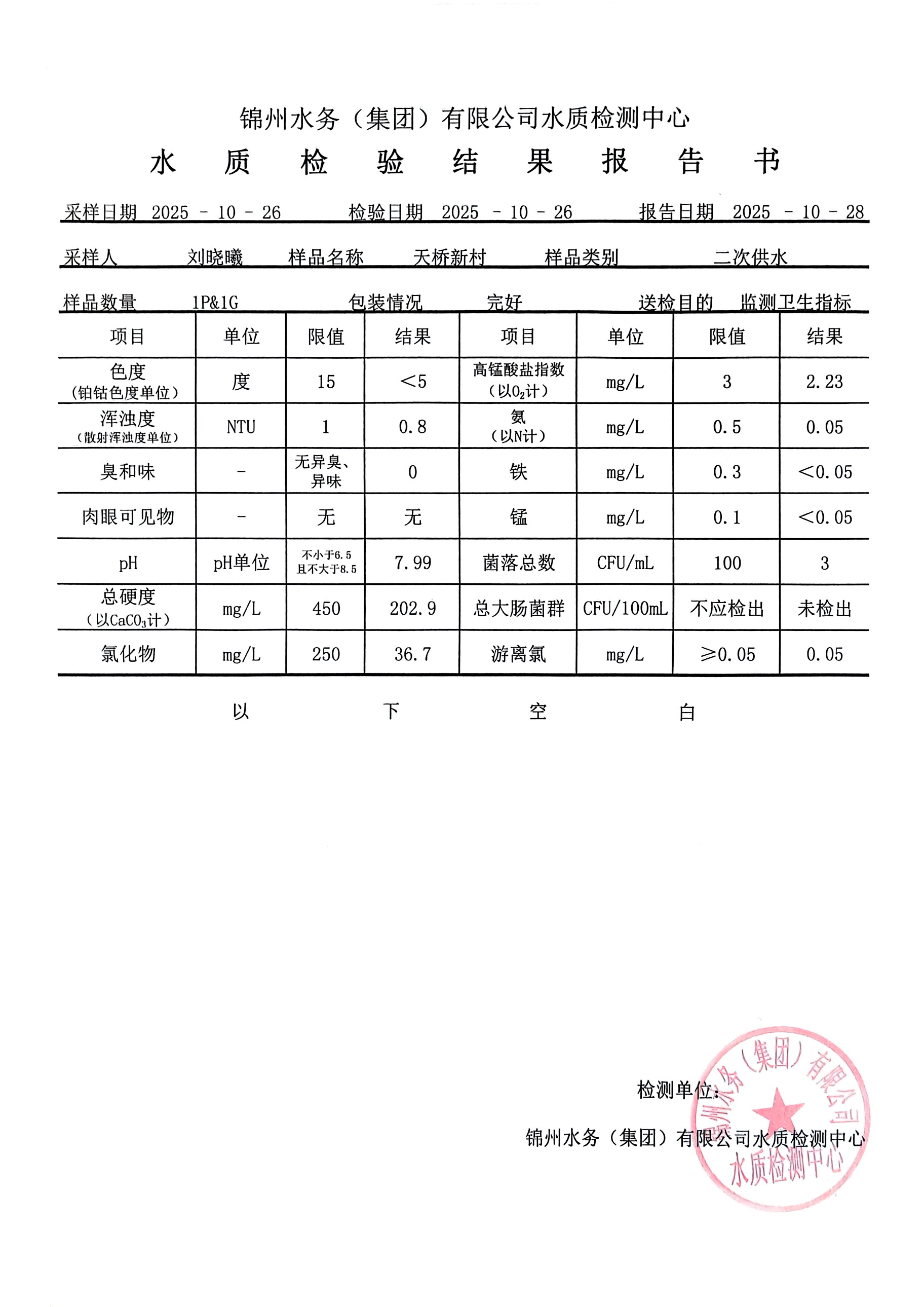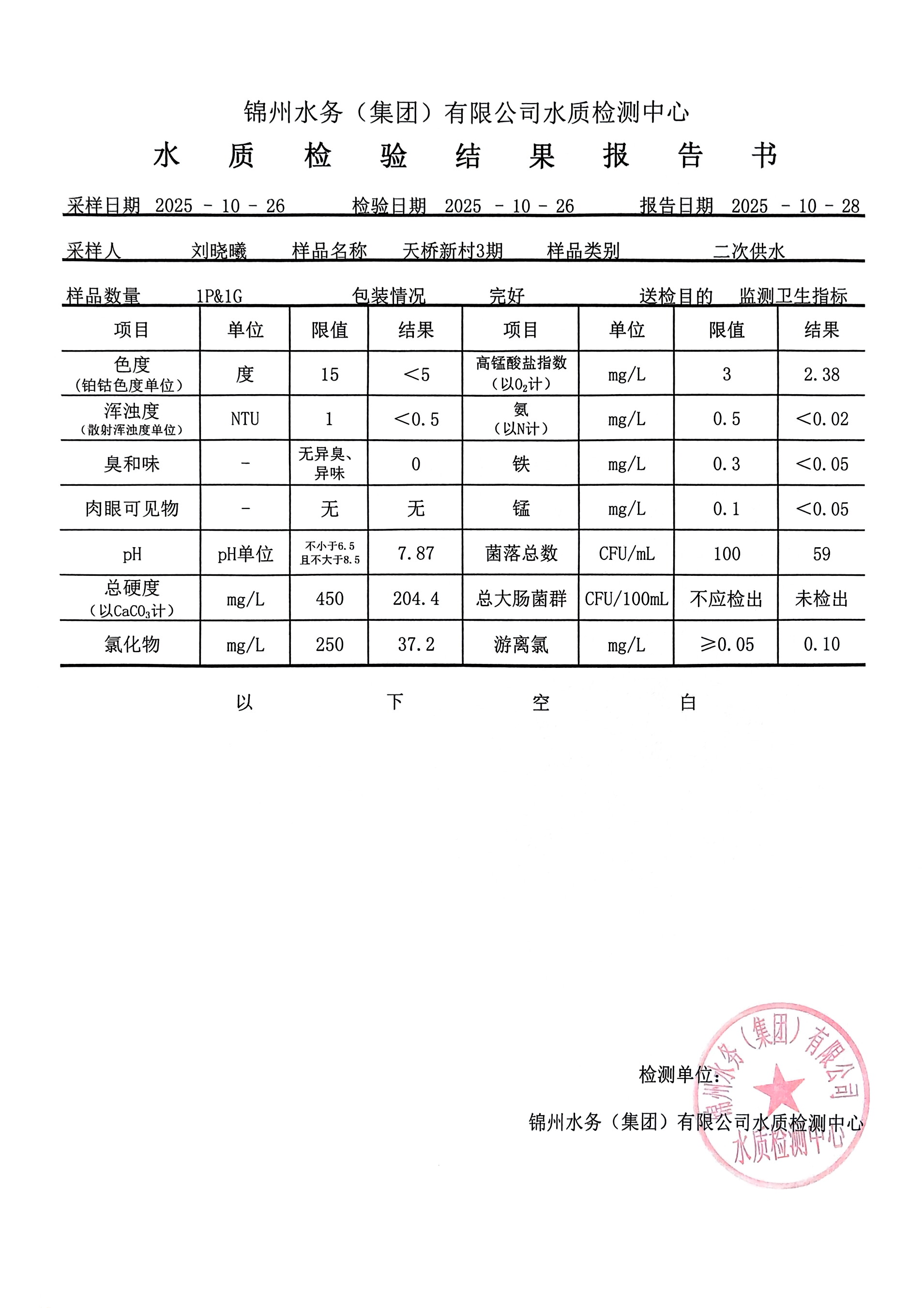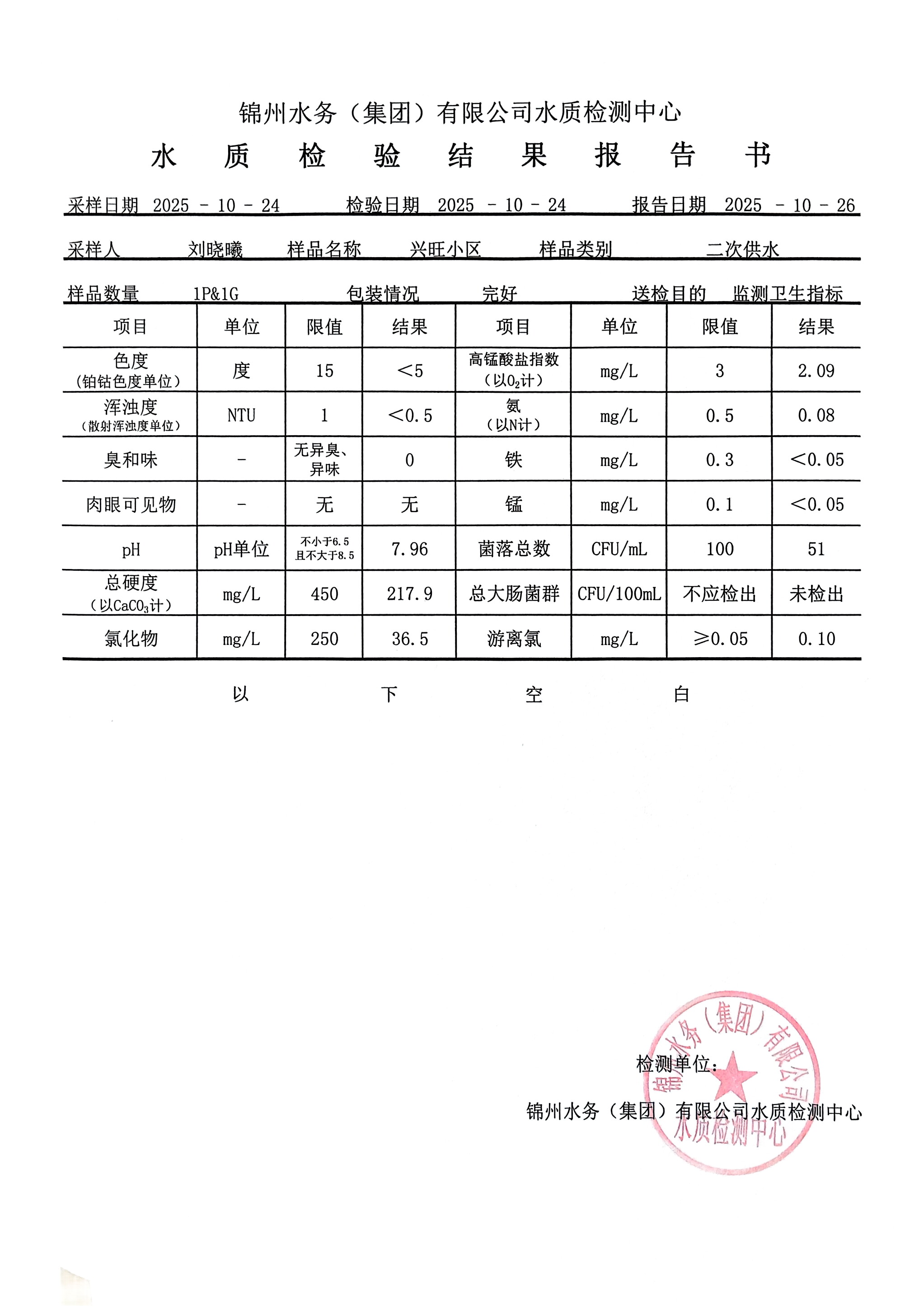 2025年10月26日—11月1日 二次供水检测报告水质报告
