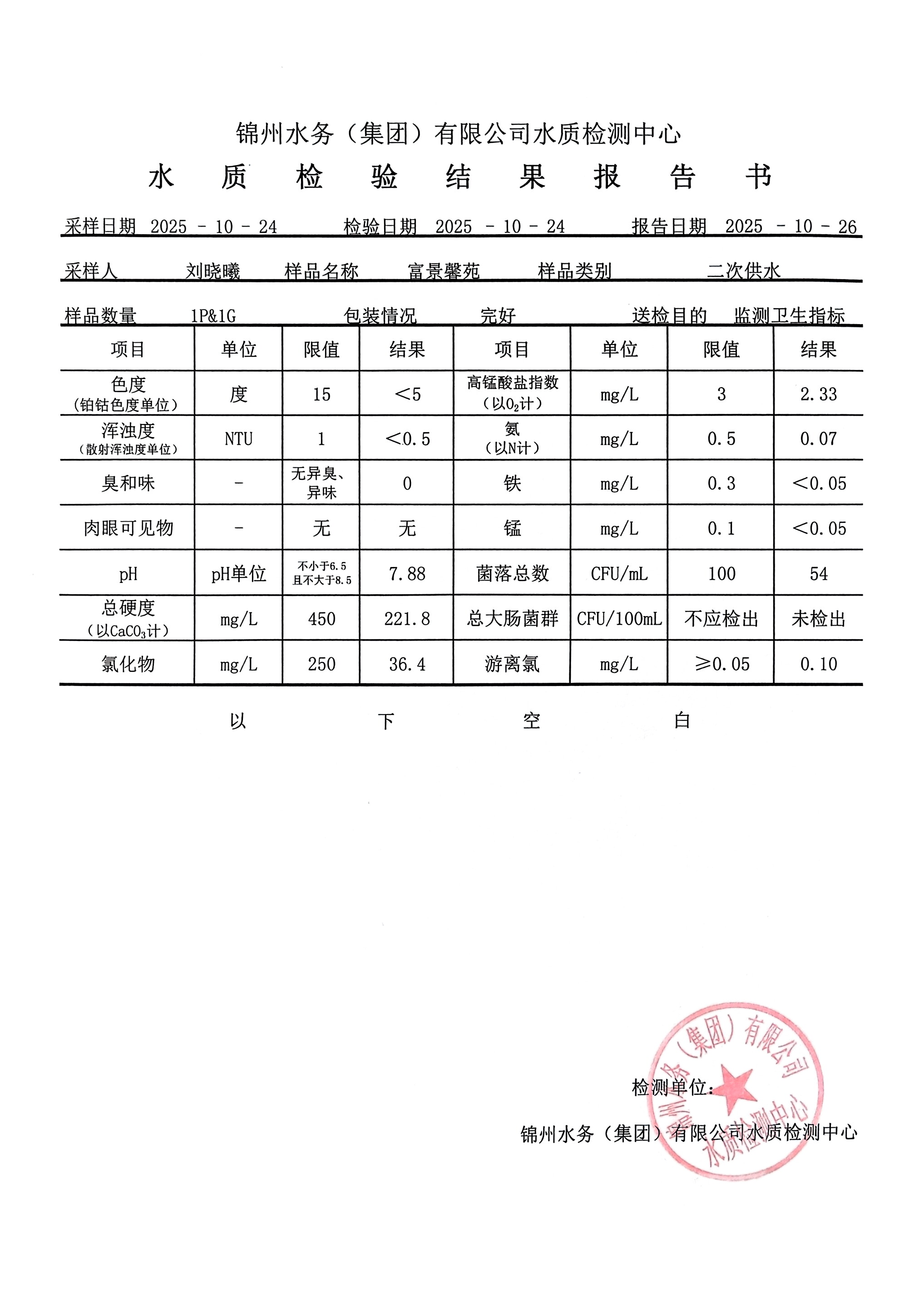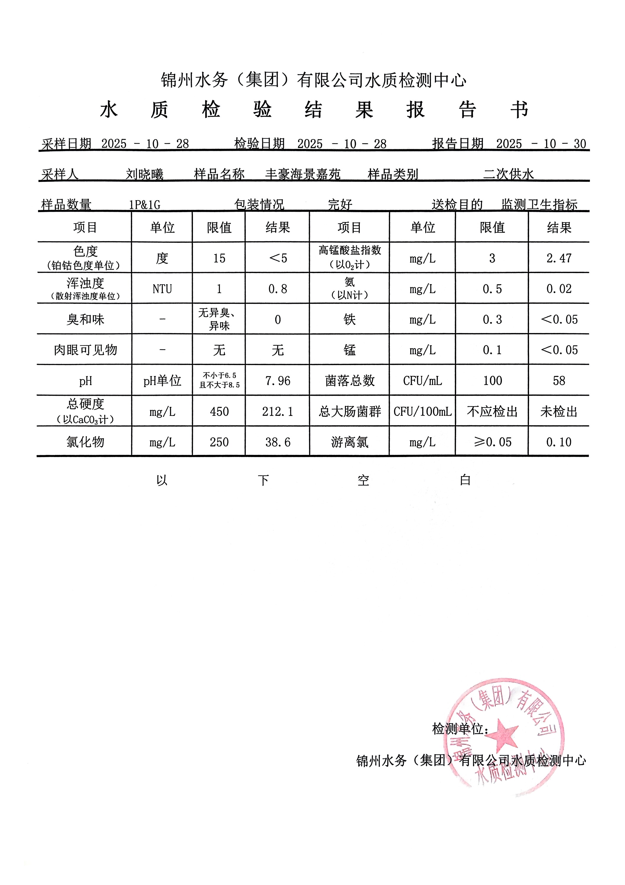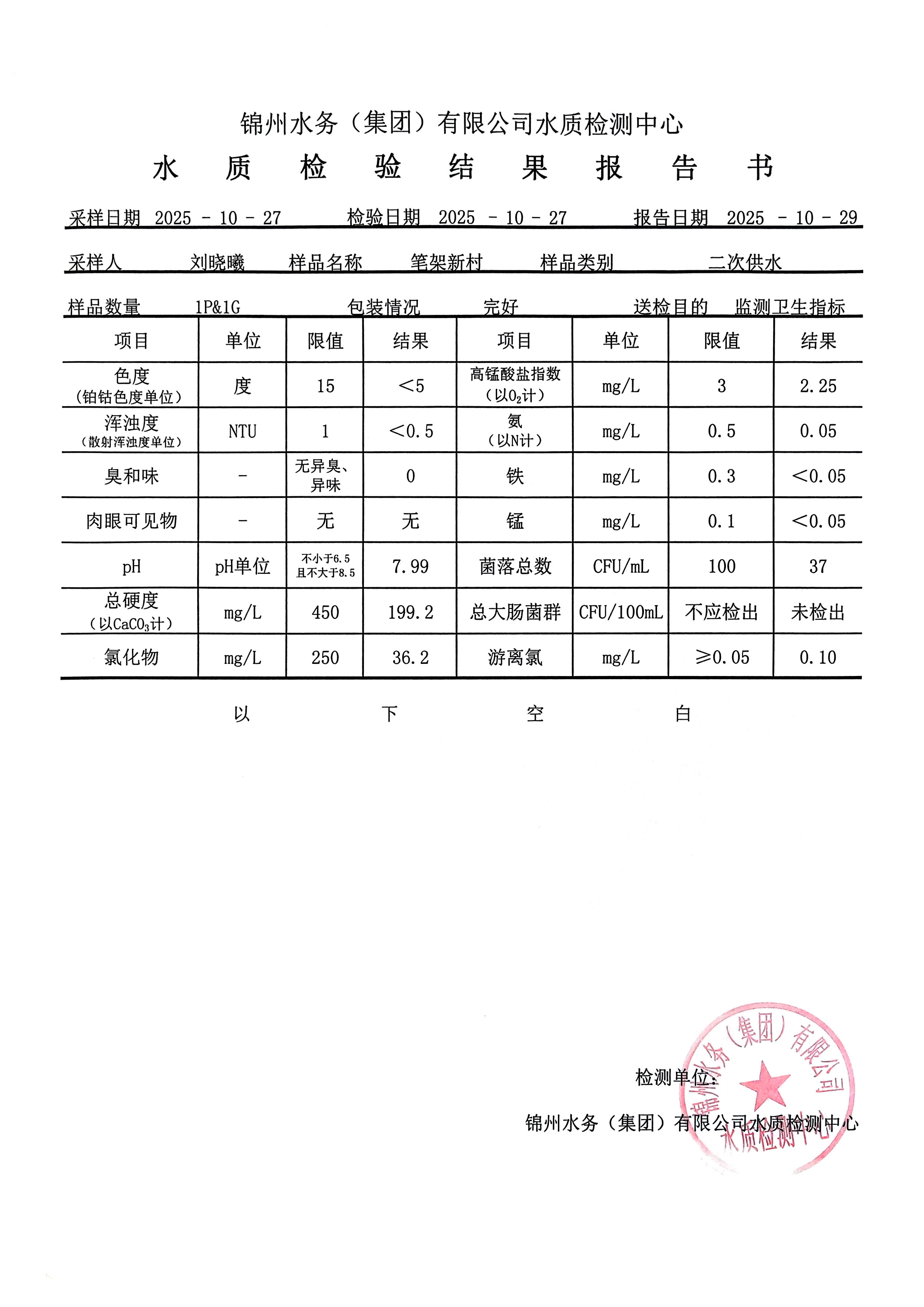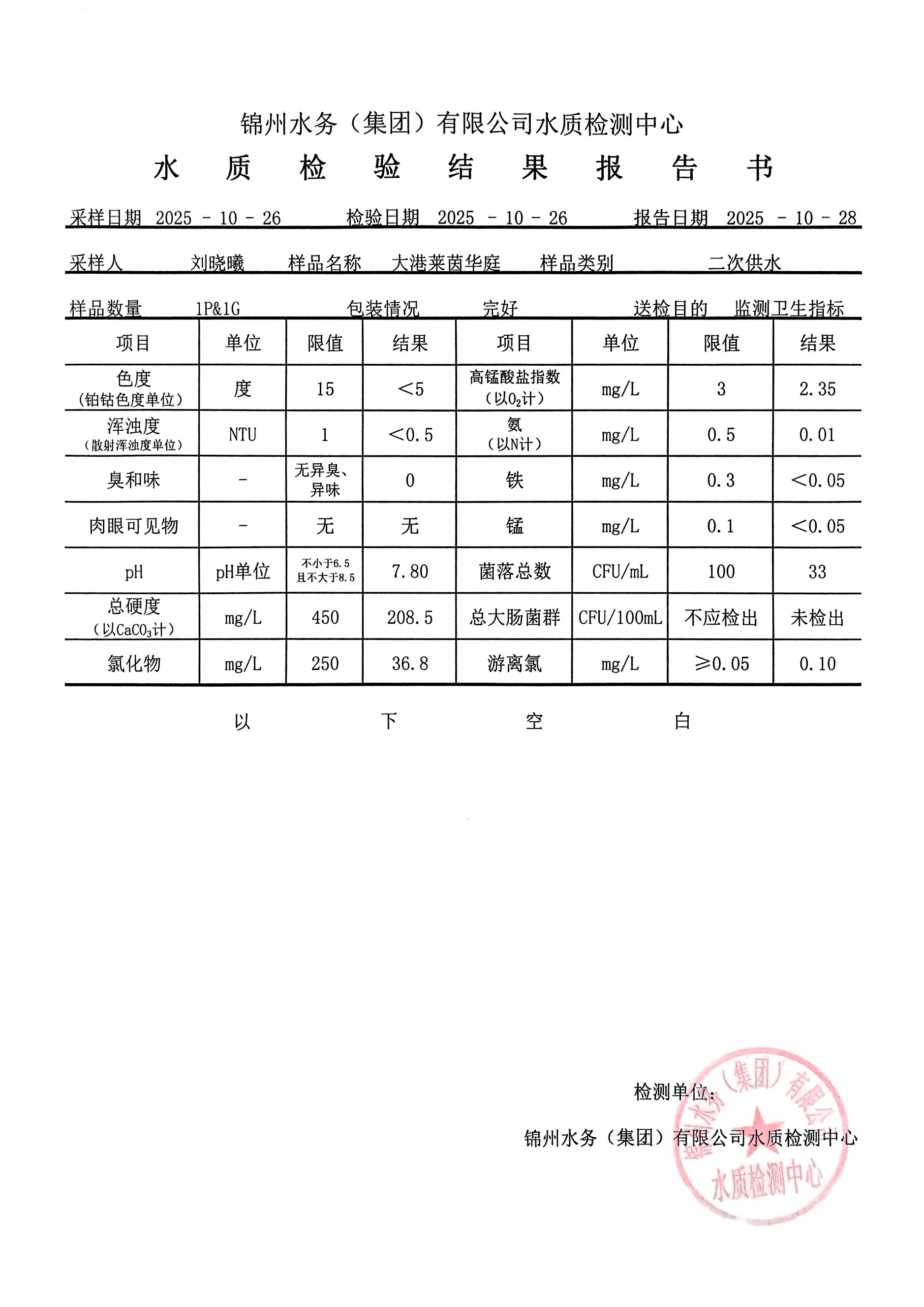 2025年10月26日—11月1日 二次供水检测报告水质报告
