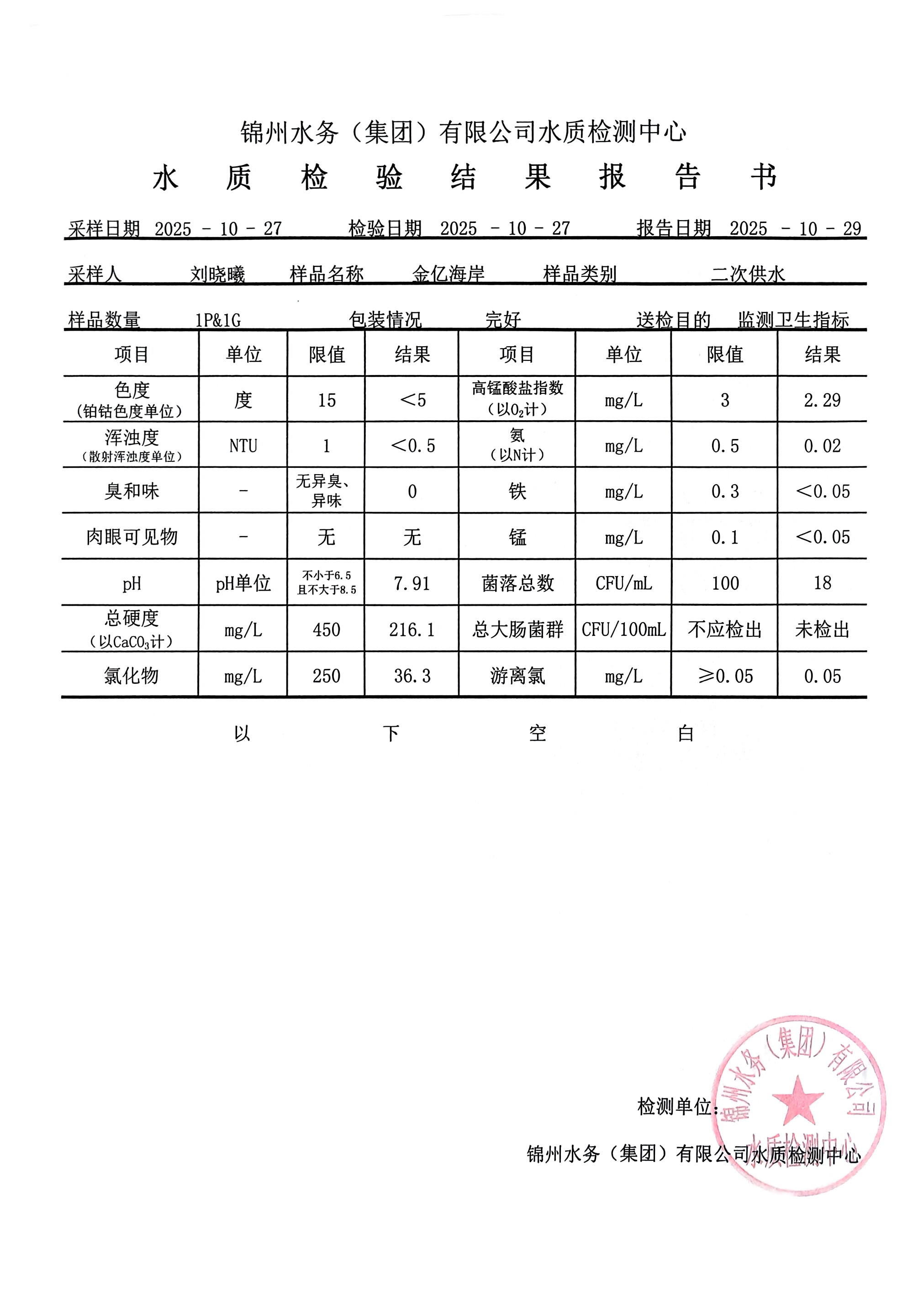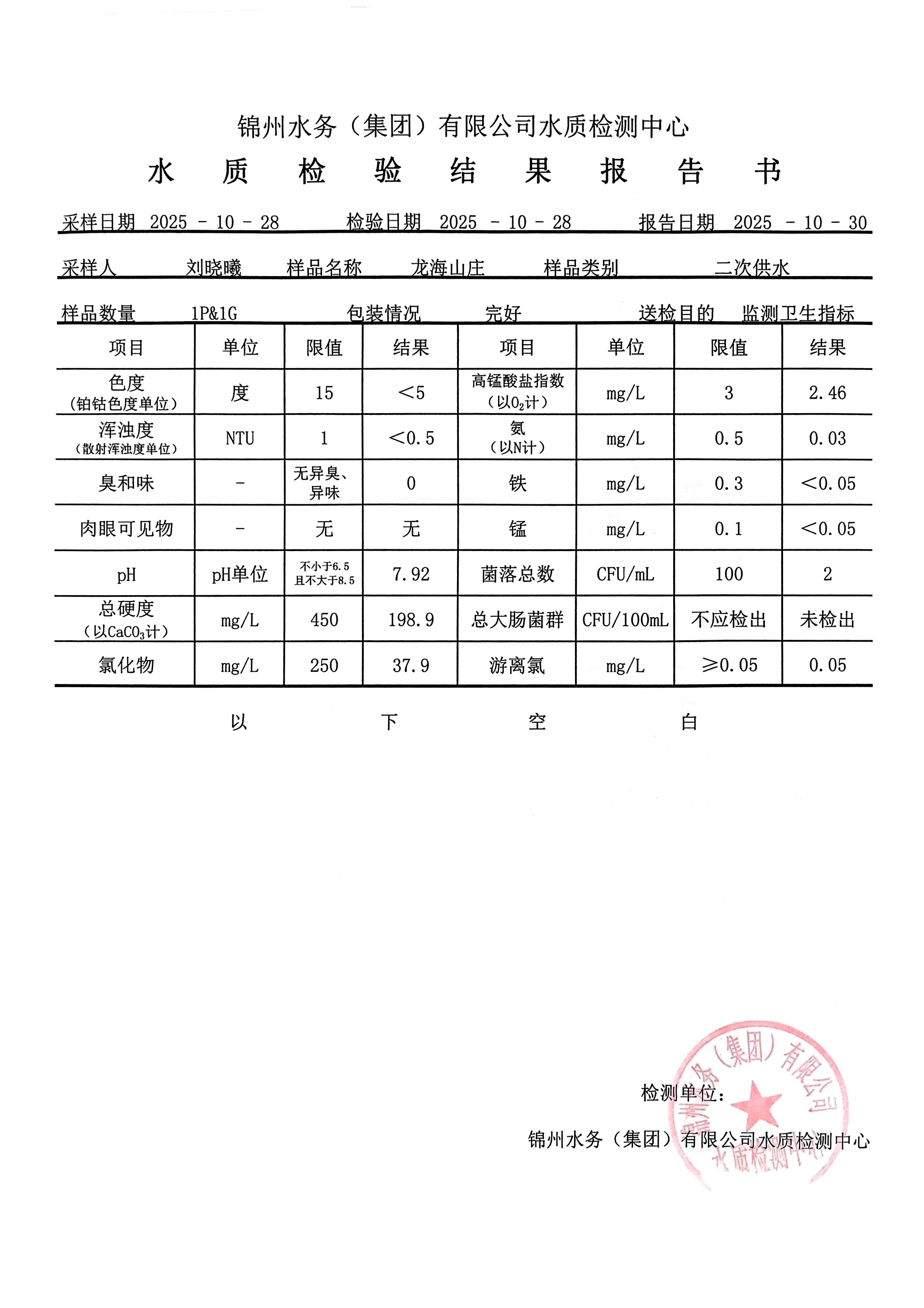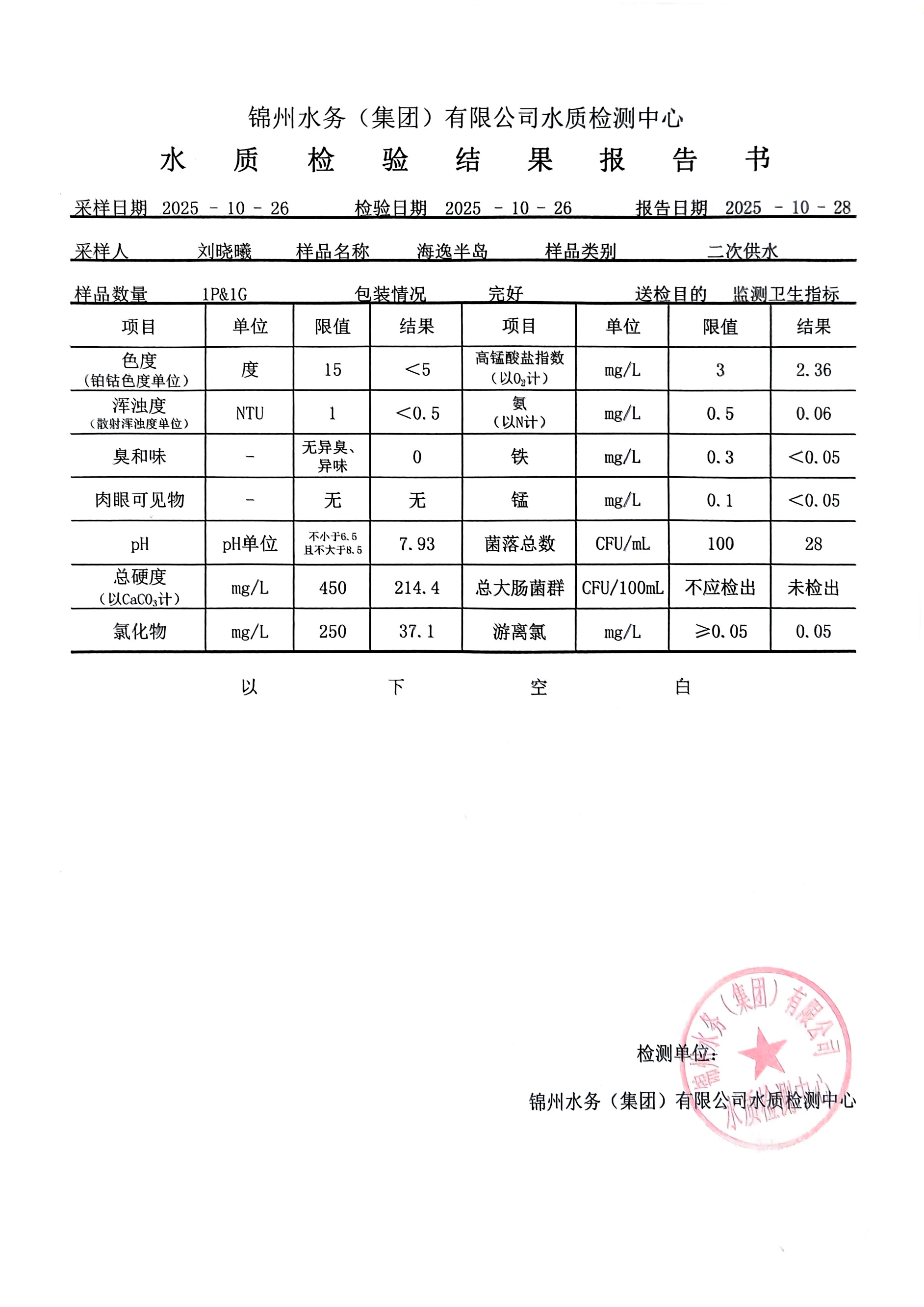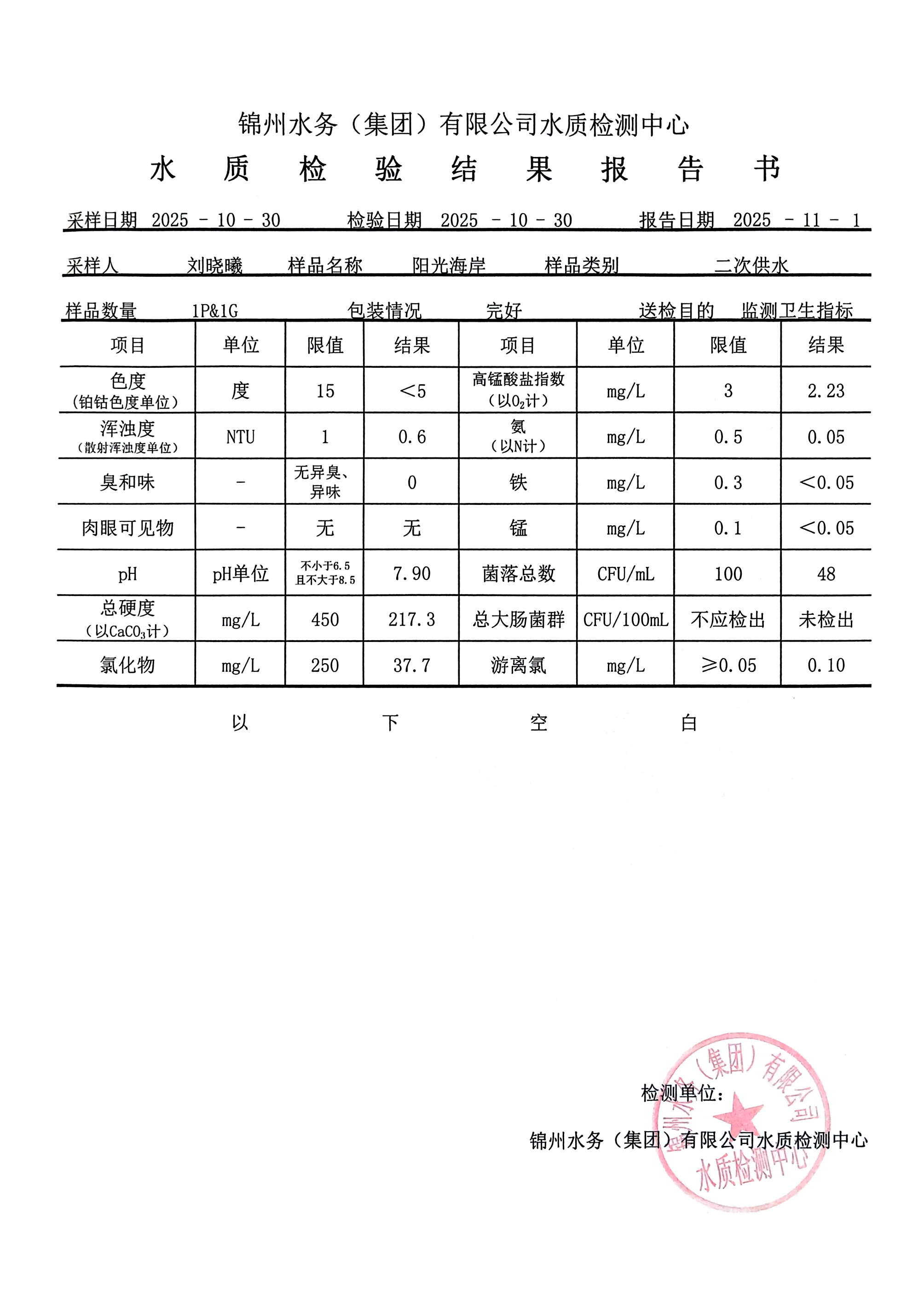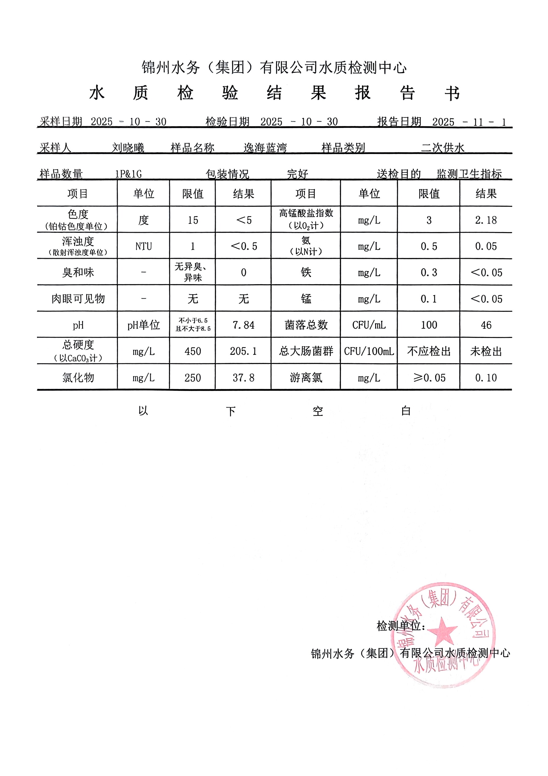 2025年10月26日—11月1日 二次供水检测报告水质报告